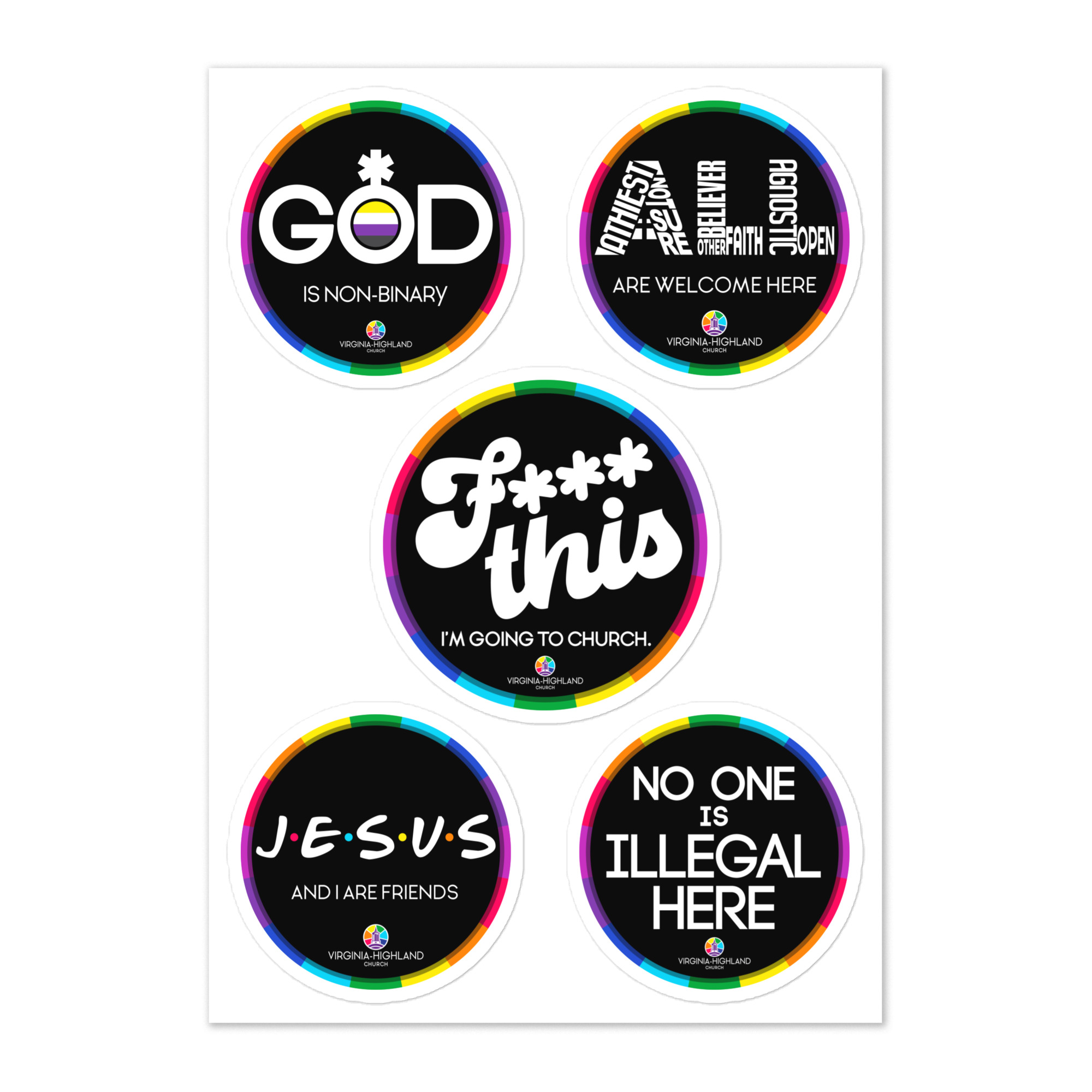 This sticker sheet features five iconic VHC stickers including F*** This…, God is Non-Binary, All Are Welcome Here, Jesus and I Are Friends, and No One is Illegal Here.